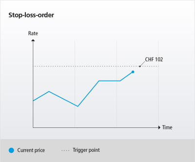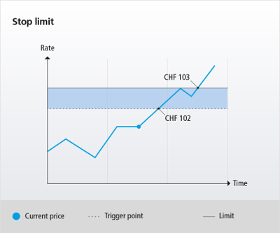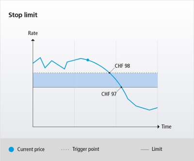 For example, the investor wishes to sell only if the security falls to CHF 98 but not below CHF 97. Once the order is triggered, it appears in the market as an order with a limit at CHF 97.
