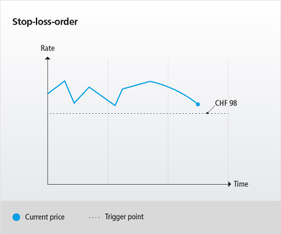 For example, a person only wants to sell if the security falls to CHF 98 or less. He thinks that it will fall again and wishes to sell before incurring greater losses. From CHF 98, a market order is triggered.