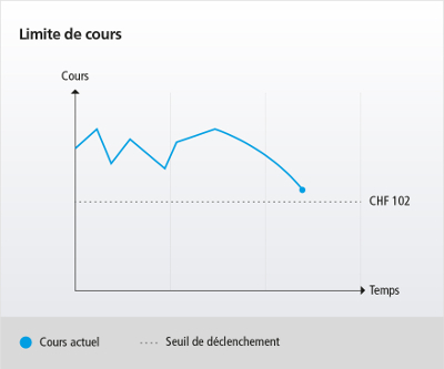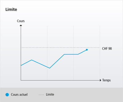 Par exemple, l�utilisateur de la plateforme d�cide de ne pas vendre � moins de CHF 98. L�ordre est plac� pour un temps donn� et ne sera ex�cut� que si le cours de l�action est sup�rieur � CHF 98.