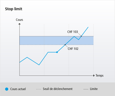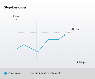 Par exemple, une personne souhaite acheter uniquement un titre si son prix atteint CHF 102. Elle esp�re d�celer une tendance, elle pense que le cours du titre va monter, elle souhaite donc l�acheter � partir de ce prix qui d�clenchera un ordre au mieux.