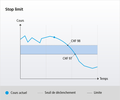 Par exemple, l�investisseur souhaite vendre seulement si le titre descend � CHF 98 mais pas � moins de CHF 97. Une fois que l�ordre est d�clench�, il apparait dans le march� comme un ordre limit� � CHF 97.