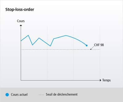 Par exemple, une personne souhaite vendre seulement si le titre baisse � CHF 98 ou moins. Elle pense qu�il va chuter encore, elle souhaite vendre avant d�enregistrer de plus importantes pertes. A partir de CHF 98, un ordre au mieux est d�clench�.