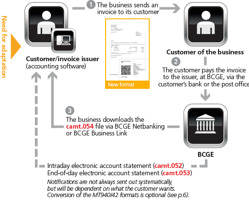 - The electronic and automated monitoring of QR-bill payments requires the switch to ISO20022 (camt) format. The camt.054 file that replaces the current BVR file (V11) will reconcile, during the transition period, both QR-bill payments and BVR payments.