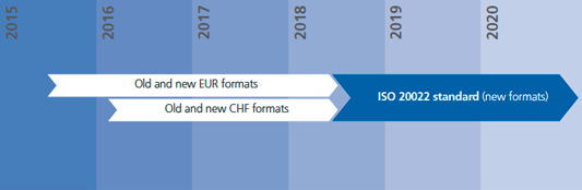 The ISO 20022 international standard is becoming the standard for electronic payment orders. Current procedures for credit transfers at banks (DTA) and PostFInance (EPO, ECA, BVR) are being harmonised. Ultimately, IBAN will be the single account-identification number, taking the place of current account numbers.Key dates: